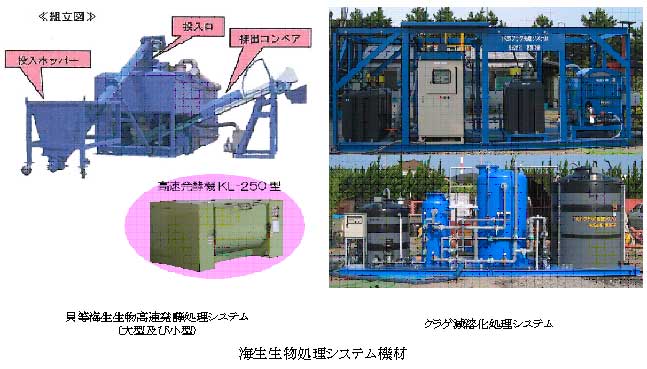 - Machine for high-speed fermentation of shellfish and other marine organisms (large machine and small machines). Processing capacity: Approximately 5 t/day (large machine), and approximately 250 kg/day and 80 kg/day (small machines)