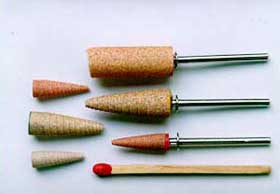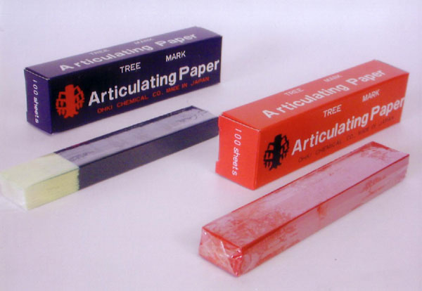 Polishing materials for dentists and dental technicians, which are called “paper cones,” are made of sandpaper rolled up into conical or cylindrical shapes. Usually an original paper cone has no shaft, and a fork end shaft sold separately is used. However, a small-sized Mini Cone is supplied with its specified fork end shaft, and other products such as Sharp Mini and Sharp Cone are supplied with an Ohki-invented wood screw type shaft exclusive to fitting. The characteristic is its sharp conical shape and strong retention with low eccentricity. As for an articulating paper for dentists, we are the only company in Japan which uses thick Japanese paper, Washi. The articulating paper is a product into which non-dry ink with rich coloring matter like blue or red is interfused and adsorbed by brushing. By using the paper, coloring can be achieved enough to the occlusion position where pressure is applied, and the grade of pressure can be also indicated.