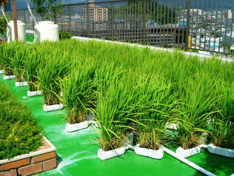 - Wet-rice farming/roof greening system by reusing plastic bottles