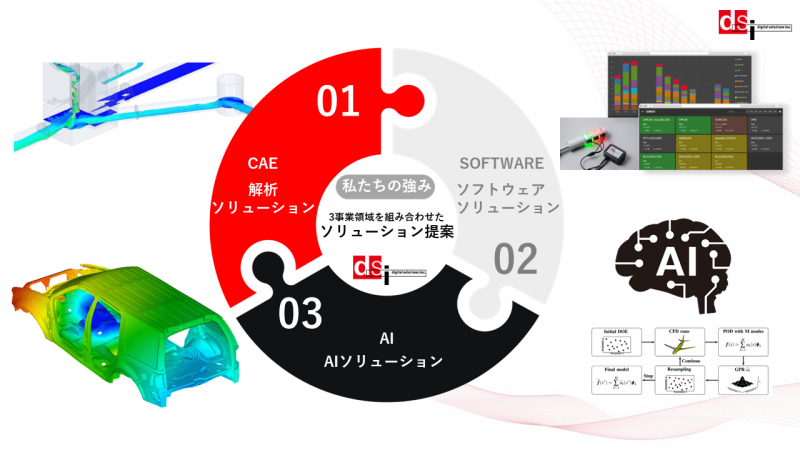We take on the challenge of proposing optimal solutions in response to customers' requests by making full use of digital technology centered on three solutions: "analysis," "software," and "AI."