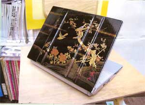 ノートパソコンに梅に鶯、研ぎ出し高盛磨き蒔絵を施した。楽器他何にでも漆で描く事が出来る。